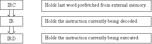 The IRC and IR registers are the actual prefetch queue. The IRD is the only register that is somehow seen externally at the programming model. And because of this reason the IRD register is sometimes referred simply as IR. You can’t access this register directly, but its content is the one that is stored in the exception frame on a bus or address error.